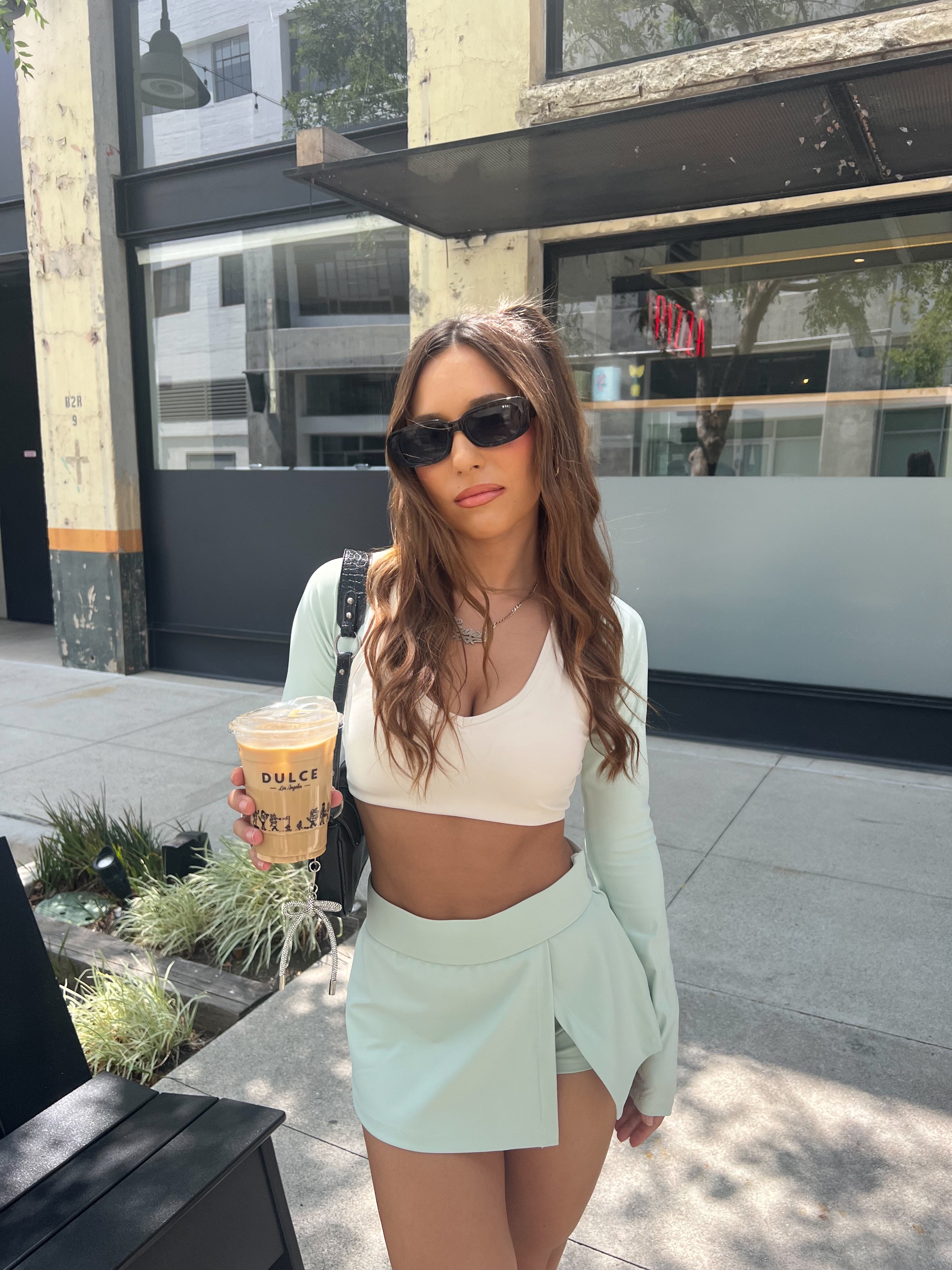 Mint mini skort with side slit revealing shorts lining. Cute, flirty style is perfect to wear on and off the court. Also available in pink and white.