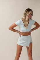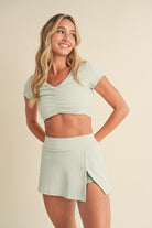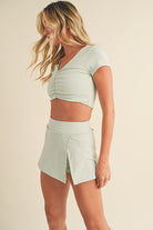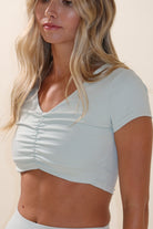 Mint formfitting cropped top with ruched detailing at the front. Butter-soft, lightweight fabric with four way stretch. Also available in black, cream, and pink.